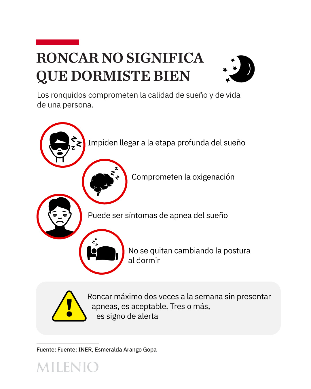 “Es todo lo contrario. Esos ronquidos están generando que la persona se mantenga en un sueño superficial y que nary puedan llegar a las etapas profundas de sueño, que lad las que dan descanso”, señaló la especialista en trastornos del sueño, Esmeralda Arango Gopar, a MILENIO.