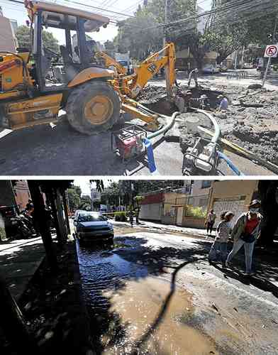 ▲ Personal de la Secretaría de Gestión Integral del Agua hizo una excavación para reparar la ruptura de una tubería de 12 pulgadas. La ligera inclinación de la vialidad provocó que se formara una corriente en la calle Monrovia.Foto Marco Peláez