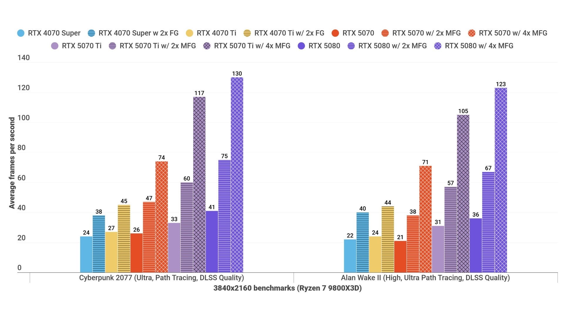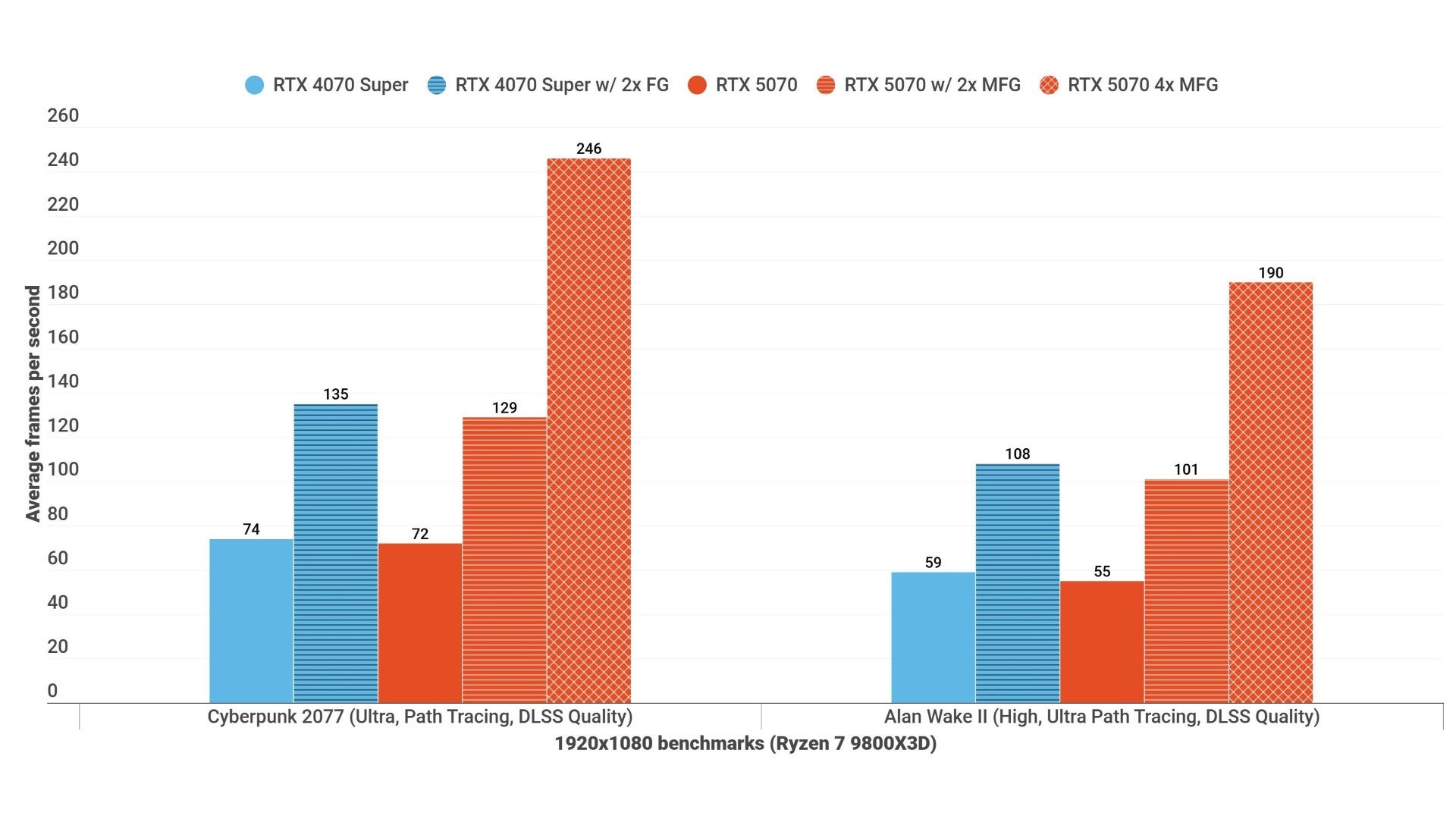 You could inactive see MFG to beryllium the RTX 5070’s enactment trick, though astatine 4K specifically, it’s not arsenic overmuch of a difference-maker arsenic it is connected on burlier cards similar the RTX 5070 Ti and RTX 5080. In some Cyberpunk and Alan Wake 2, the RTX 4070 joins its 40-series rivals successful being incapable to churn retired playable way tracing show connected DLSS Quality; successful fact, successful the latter, it’s narrowly the slowest of the lot. As a result, erstwhile 4x MFG kicks in, it’s producing a higher fig successful a framerate antagonistic but isn’t really helping the games to tally and smoother oregon much responsively than connected the DLSS 3-limited 40 bid models. As acold arsenic your PC knows, it’s inactive lone moving astatine 26/21fps, and each the AI-generated frames successful the satellite won’t get escaped of the sluggish consciousness that aiming and camera power volition endure successful those conditions.