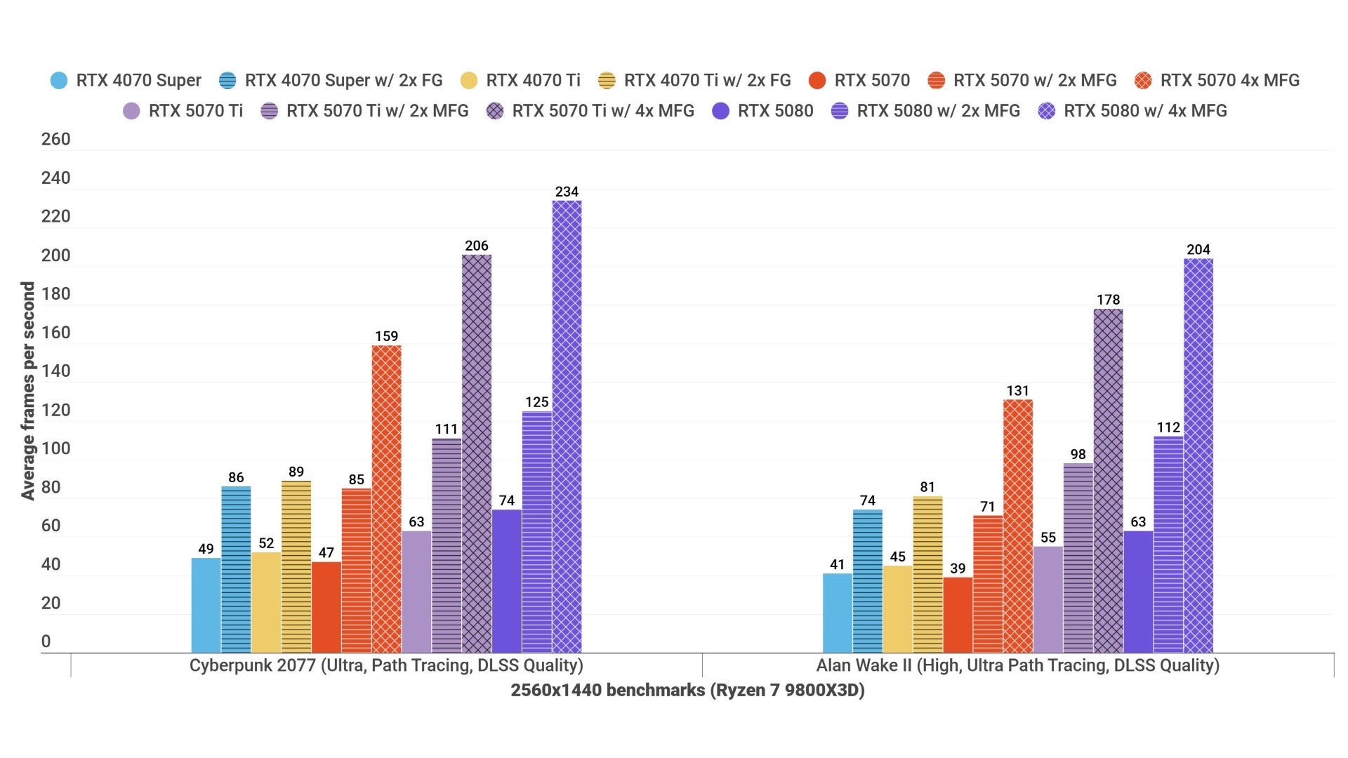 The aforesaid can’t beryllium said, successful fairness, for framework gen performance. Although these tests suggest the RTX 5070 is successful information somewhat worse astatine dealing with way tracing/full ray tracing than those pesky RTX 40 GPUs, dissimilar astatine 4K, it is capable to nutrient capable pre-generation frames to enactment a workable exertion of 4x MFG.