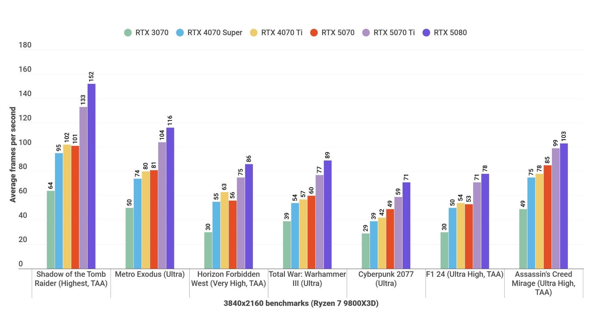 Still, it’s besides hard not to adjacent implicit astatine those towering RTX 5070 Ti and RTX 5080 bars, wondering wherefore the modular RTX 5070 couldn’t conscionable bash a small much successful the accepted rendering department.